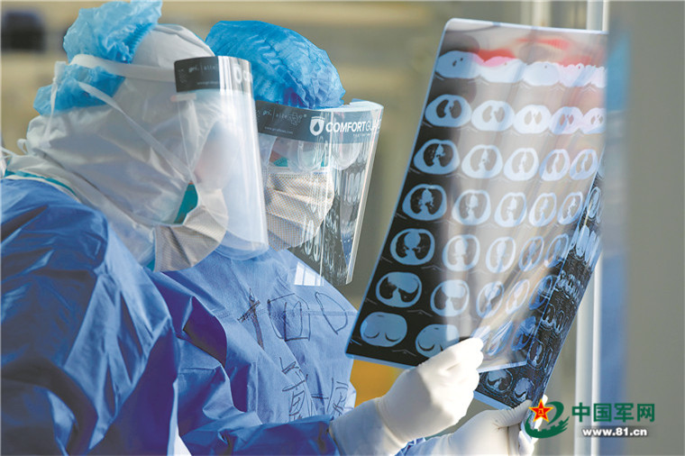 2月8日下午,从武汉定点收治医院转来的新一批新冠肺炎确诊患者,陆续抵达武汉火神山医院。图为医疗队队员查看患者病历资料。解放军报记者 范显海摄