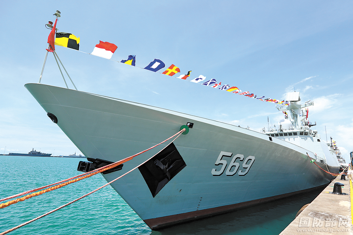 参展的玉林舰停泊在新加坡樟宜港。潘小员摄