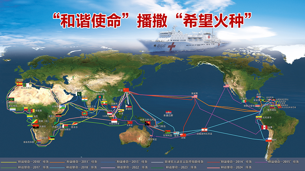 张晓刚: 2010年以来,“和平方舟”号医院船高扬仁爱之帆,先后10次执行“和谐使命”任务,航程32万余海里,遍及3大洋6大洲,到访52个国家和地区,提供37万余人次医疗服务,用大爱仁心播撒“希望火种”,与到访国民众结下深厚情谊。今后,中国海军将继续执行“和谐使命”任务,用更多的“生命之舟”提供高质量公共安全产品,续写践行全球安全倡议、服务构建海洋命运共同体的温暖篇章。
