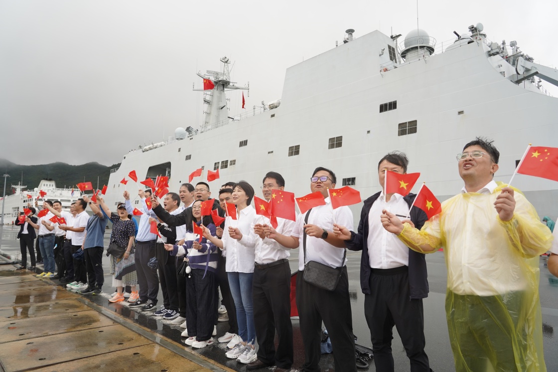 11月21日,在越南金兰港,当地民众身着越南传统服饰到码头迎接中国海军989编队。新华社发(段振军摄)