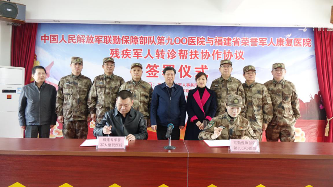 2020年1月2日上午,福建省荣誉军人康复医院(简称省荣军医院)与中国人民解放军联勤保障部队第九〇〇医院(简称联勤保障部队第900医院),在省荣军医院门诊医技楼三楼会议室签署“残疾军人转诊帮扶协作协议书”,省荣军医院练毕全副院长(主持工作)与联勤保障部队第900医院林叶青副院长现场签约。省退役军人事务厅罗庆春副厅长、建瓯市雷佩兰副市长、联勤保障部队第900医院专家团队、退役事务厅优抚褒扬纪念处一级调研员熊军民在主席台见证签约,省荣军医院在院残疾军人(简称休养员)代表、院干部职工代表、建瓯市退役军人事务局等相关部门工作人员目睹了这一盛况。此次转诊帮扶协议的签订,是贯彻习近平总书记关于做好退役军人工作和双拥工作系列重要论述精神的重要举措,也是省退役军人事务厅为解决省荣军医院休养员转诊就医难问题的重要举措,又是双方医院寻求共进、实现共赢的一次重要合作。此次签约协议内容共有五条,一是联勤保障部队第900医院将为省荣军医院休养员开辟绿色通道,为他们提供优先、优惠、优待的医疗卫生服务;二是派医疗专家为收治对象进行义诊;三是对荣军医院工作人员进行培训及安排进修学习;四是省荣军医院休养员患有危、急、难、重症病时,优先转诊联勤保障部队第900医院;五是省荣军医院为联勤保障部队第900医院提供临床实践基地。