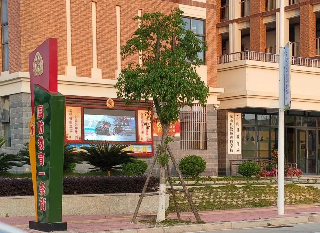 近日,东山县国防教育一条街建成投入使用,该街道位于东山县文昌学校旁,投资10万余元,全长共700米左右,共设16个国防教育宣传展板,1个LED视频播放模块,62个国防教育宣传标语牌。