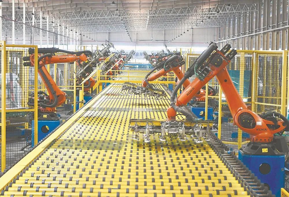 在福耀玻璃集团汽车玻璃生产车间,机械手在生产线上作业。新华社 发