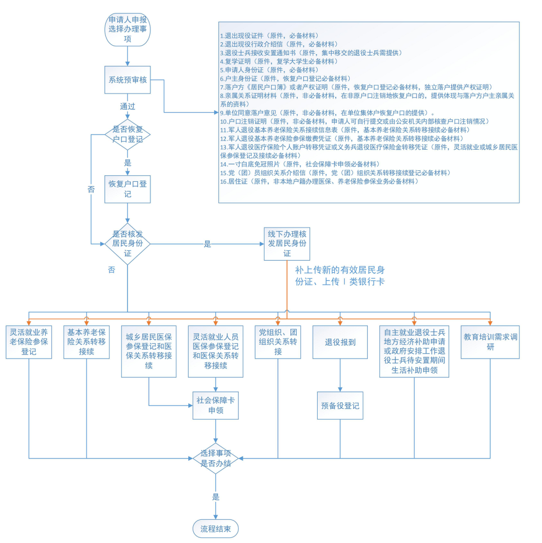 (七)党组织、团组织关系转接:退役士兵党员携带《入党志愿书》复印件等相关材料,按要求到基层党组织成功报到后,基层党组织应于2个工作日内为退役士兵党员办理组织关系接收手续。退役士兵通过“军人退役一件事”线上办理系统对接的“智慧团建”系统完成信息填报,按照转入地基层团委要求完成团员报到后,基层团组织在通过审核后,1个工作日内为退役士兵办理团组织关系转接工作。