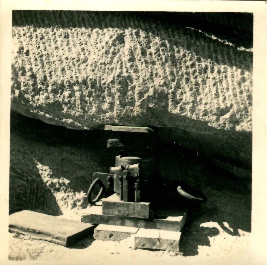 碑心石开采过程中,置放在窝龛中的千斤顶支撑着石块。青岛道路交通博物馆供图