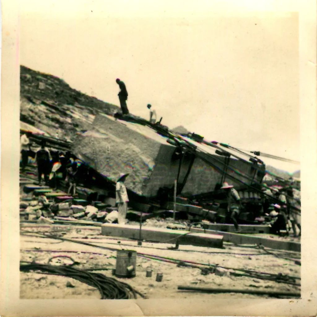 在研究设计方案的同时,纪念碑的施工准备工作也在紧张有序进行。其中,建筑石材的准备是重中之重。碑心石开采、运输背后的故事被人津津乐道,整个开采过程凝聚和体现了人民群众的智慧与创新精神。按照设计,碑心石须是一块长约15米、宽3米、厚约0.6米的整块花岗岩。为了保证碑心石不折断,开采石料的毛坯厚度必须达到3米,这意味着毛坯石料将重达300吨。如何安全取得如此厚重的整体石块,是一个巨大的挑战。碑心石取自青岛浮山。起初,工人采用爆破技术进行开采,连试两次都没能成功。后来,在当地老石工的建议下,施工人员在选定的石料四周挖开4米深槽,再沿着石槽在预定剥离面上凿出若干楔子眼。同时,在石料长边两边相对凿出8个置放千斤顶的窝龛,其中都放置200吨千斤顶。开采时,由几十人持重锤将铁楔子插入预定的剥离线中,按照口令同时锤击。渐渐地,重达300多吨的碑心石料终于成功地从岩体上剥离下来。