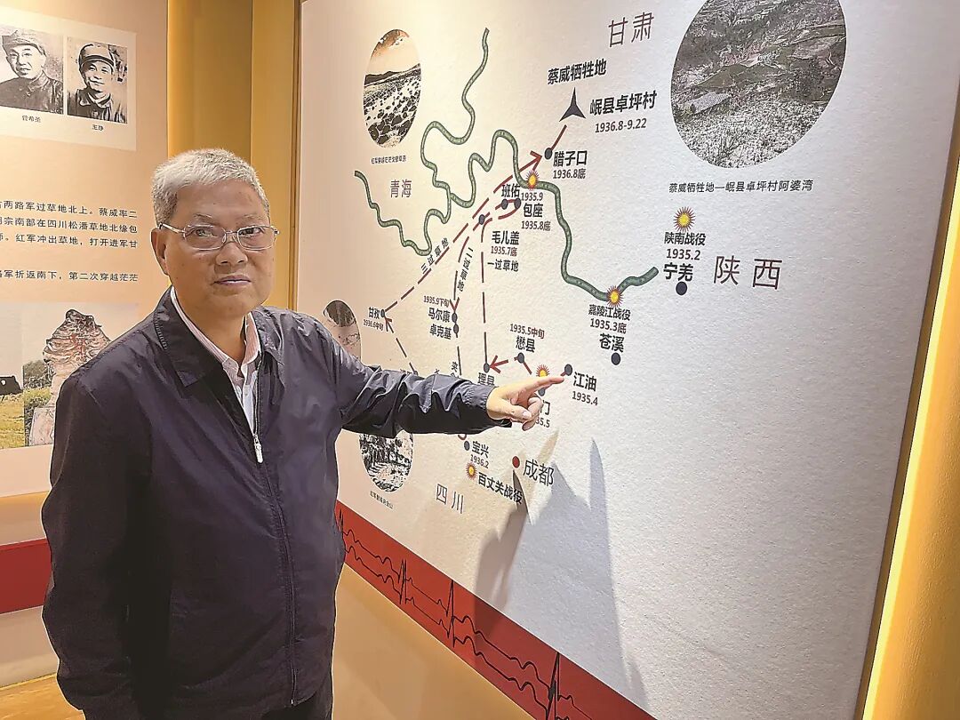 蔡述波在蔡威事迹展览陈列馆讲述蔡威烈士在长征途中的故事。