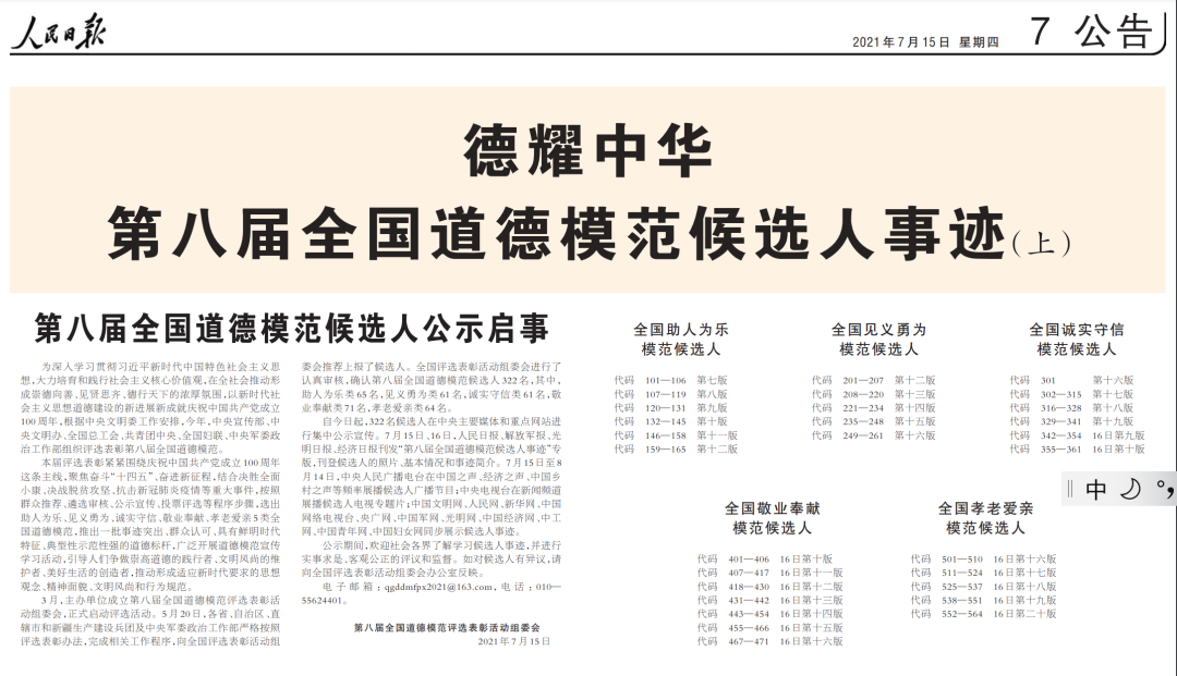 今年,中央宣传部、中央文明办、全国总工会、共青团中央、全国妇联、中央军委政治工作部组织评选表彰第八届全国道德模范。全国评选表彰活动组委会进行了认真审核,确认第八届全国道德模范候选人322名,其中,助人为乐类65名,见义勇为类61名,诚实守信类61名,敬业奉献类71名,孝老爱亲类64名。