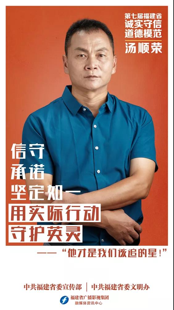 汤顺荣,男,1976年3月出生,将乐县水南镇渡头村村民。1950年,他爷爷汤七根在河边发现了一具红军烈士遗体,找不到烈士家人,便义葬了英烈。爷爷去世后,他父亲汤万丛接过棒,坚持每年祭扫。父亲去世后,作为一名退伍军人,汤顺荣继续当好红军烈士墓的守护人。汤家祖孙三代71年的默默坚守,谱写了一曲“信守承诺,爱国拥军”的赞歌。