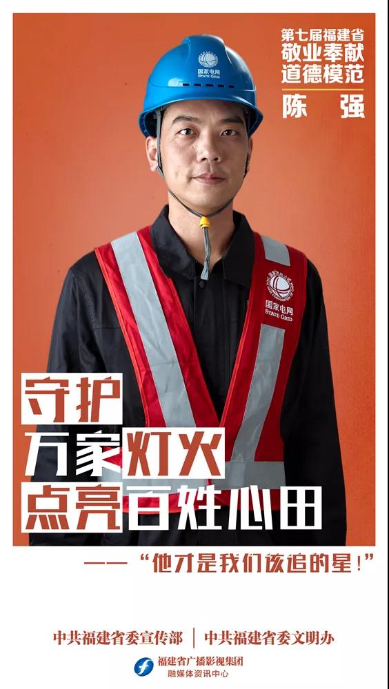 陈强,男,1979年8月出生,国网漳州供电公司配电抢修班班长。陈强从事过配电线路及电缆的运行维护、检修、抢修工作,二十多年如一日,始终坚持在第一线。苦、脏、险、累的工作环境和繁重的工作任务,练就了他吃苦耐劳、坚韧不拔的工作作风。他还积极参加助残志愿服务。他获得过省五四青年奖章、全国五一劳动奖章等荣誉。