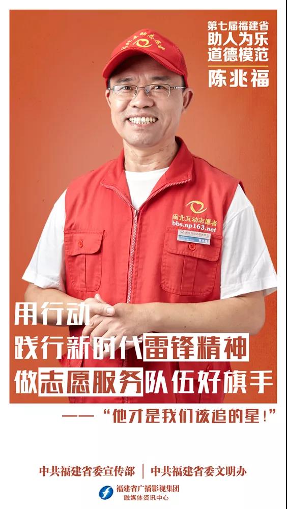 陈兆福,男,1974年2月出生,南平市闽北互动志愿者协会会长。陈兆福穿梭于城乡的大街小巷,从事志愿服务已13年。他牵头成立了“南平市闽北互动志愿者协会”,目前协会志愿服务时长达6.5万余小时,累计募集款物500余万元,结对帮扶村镇社区贫困老人260多名,资助贫困学生860余名,服务城乡群众10余万人次。