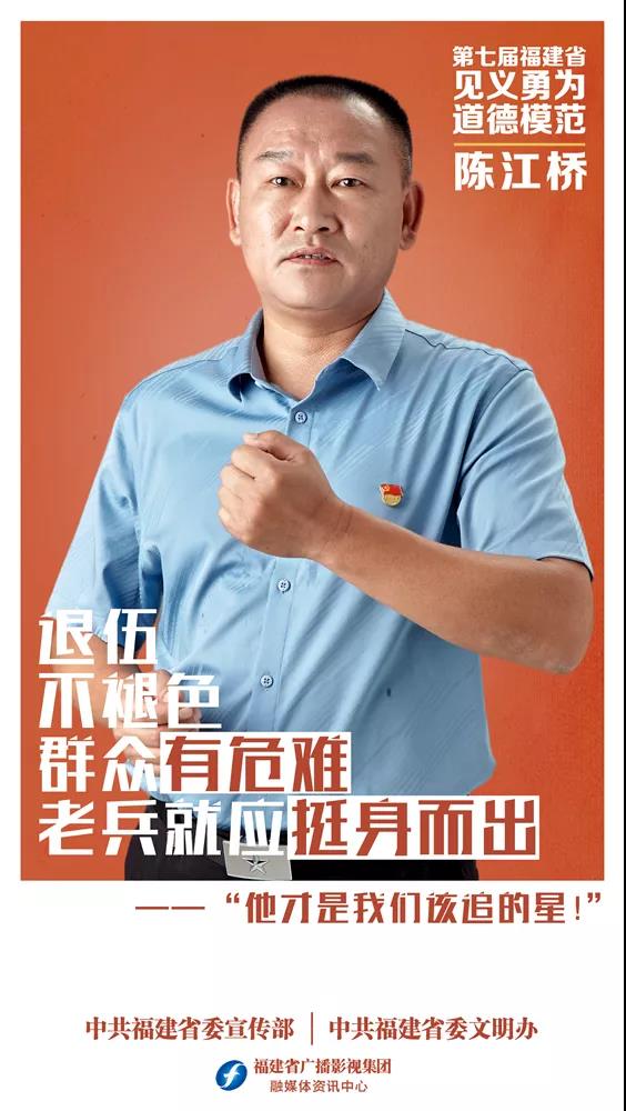 陈江桥,男,1972年10月出生,退伍军人,漳平市委宣传部办公室工勤人员。2019年7月29日12时30分许,陈江桥发现邻居家有歹徒入室抢劫,不顾个人安危挺身而出,勇敢与正在实施抢劫的歹徒搏斗,在歹徒的匕首下解救了被挟持的群众。陈江桥个人先后被各级组织授予“中国好人”“福建省见义勇为英雄”等荣誉称号。