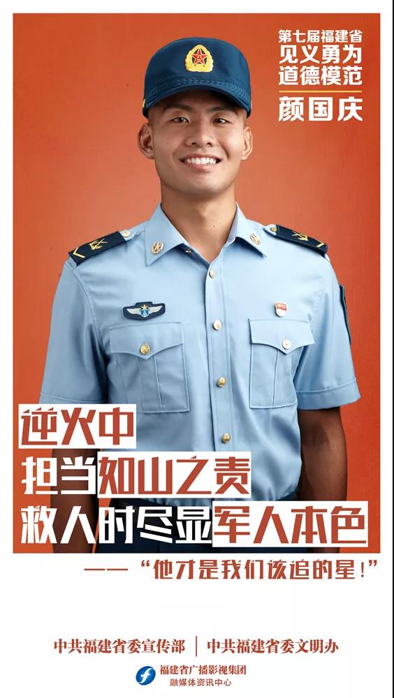 颜国庆,男,1998年10月出生,中国人民解放军94923部队76分队1排2班班长。2021年2月19日,颜国庆在献血返回途中发现火灾,在身体乏力的情况下义无反顾奔向火场,灭火过程摔倒扭伤腰部,头发、眉毛、睫毛被烧,面部灼伤。大火被控制后他才在村民的搀扶下走出火场。事后为了不让单位知道伤势影响工作,他把头发全部剃光。