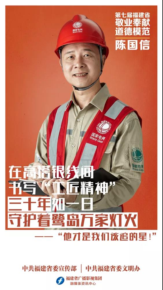 陈国信,男,1970年3月出生,国网厦门供电公司输电运检室四级职员兼分工会主席。他是全国首批输电线路技术技能带头人,享受国务院政府特殊津贴,曾获全国劳动模范称号、全国五一劳动奖章、中华技能大奖。以他名字命名的陈国信工作室被授予“全国示范性劳模和工匠人才创新工作室”。他先后荣获省部级技术成果奖15项,拥有发明专利21项、实用新型专利32项。