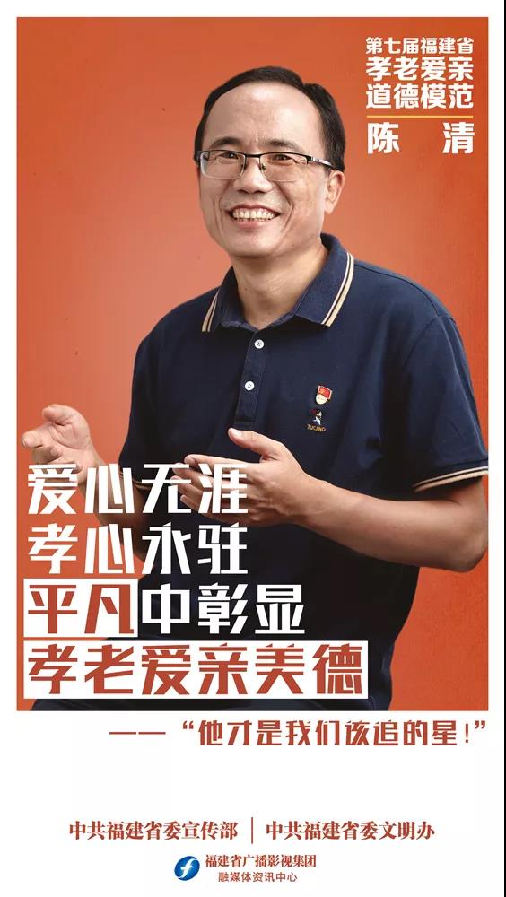 陈清,男,1978年11月出生,福建省残疾人劳动就业服务中心干部。陈清十年如一日,奔波在家庭和事业两个“战场”,艰难负重前行。他照料身患癌症的年迈父亲,抚养早产双胞胎儿女,用善良和大爱维系着一家三代人的希望。在单位和家庭,他都履职尽责、定位好“小家”和“大家”中的角色,任劳任怨,默默奉献,多次被省残联评为优秀党员、优秀工作者。