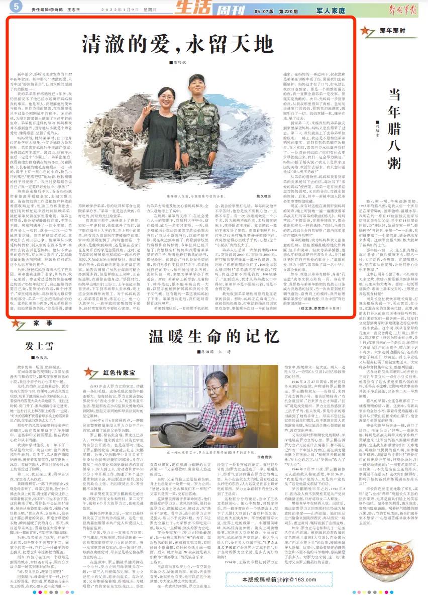 如今,我也以弟弟为榜样,身着“孔雀蓝”成为文职方阵的一员。身在军营,当那些与弟弟年龄相仿的战士日渐成为我熟悉的战友,当一次次看到他们朝气蓬勃、奋勇向上的模样,我开始理解弟弟那份“清澈的爱、只为中国”背后的家国深情……