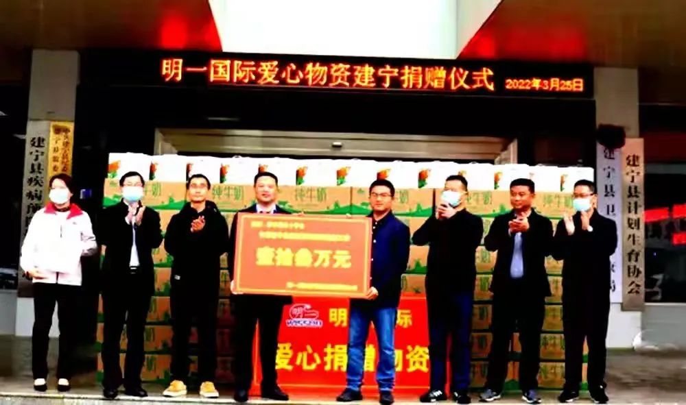明一国际营养品集团有限公司向三明市建宁县红十字会捐赠价值13.76万元的纯牛奶和奶粉,用于慰问医疗部门、交通卡点、社区志愿者等一线抗疫人员。