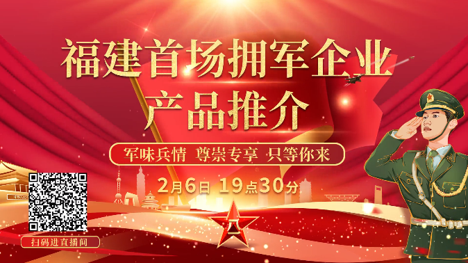 为宣传贯彻党的二十大精神,激励老兵创业之路再立新功,2月6日晚7点30分,由福建省退役军人服务中心倾力打造的“老兵直播专场”——福建首场拥军企业产品线上推介活动启动,直播期间将为现役军人、退役军人及其他优抚对象陆续推出直播专享价,只等你来!