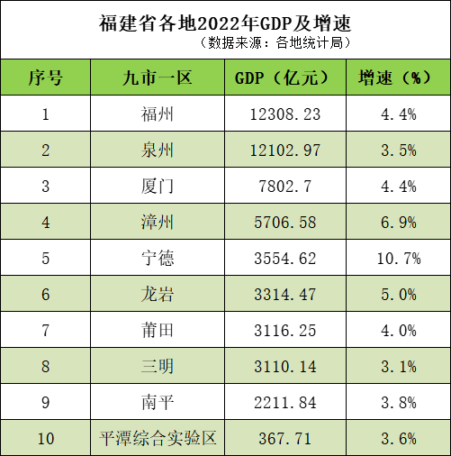 在此基础上,福建各地表现如何?根据福建省各地公布的数据,在2022年,福州、泉州两个地市的GDP总量超过1.2万亿元,依旧领跑全省;紧随其后的是厦门和漳州两个经济大市,随后依次是宁德、龙岩、莆田、三明、南平和平潭综合实验区。