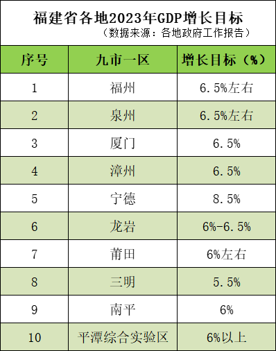 根据福建省政府工作报告,2023年福建省地区生产总值增长的预期目标为6%左右。以此为基准,福建省各地设定了新一年的预期增长目标,具体为,福州6.5%左右、泉州6.5%左右、厦门6.5%、漳州6.5%、宁德8.5%、龙岩6%-6.5%、莆田6%左右、三明5.5%、南平6%、平潭综合实验区6%以上。