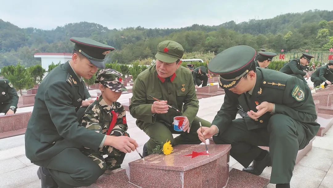 4月2日,在龙岩市永定区,老战士熊兆祥与部队官兵、少年军校学生共同为烈士墓碑描红。范启椿 摄
