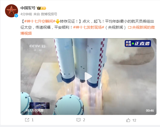 北京时间10月26日11时许,搭载神舟十七号载人飞船的长征二号F遥十七运载火箭在酒泉卫星发射中心点火发射。