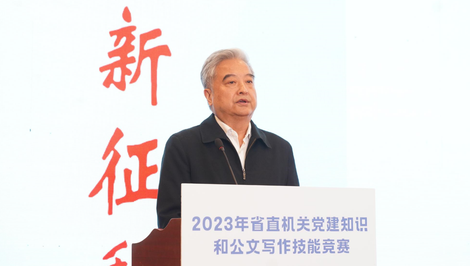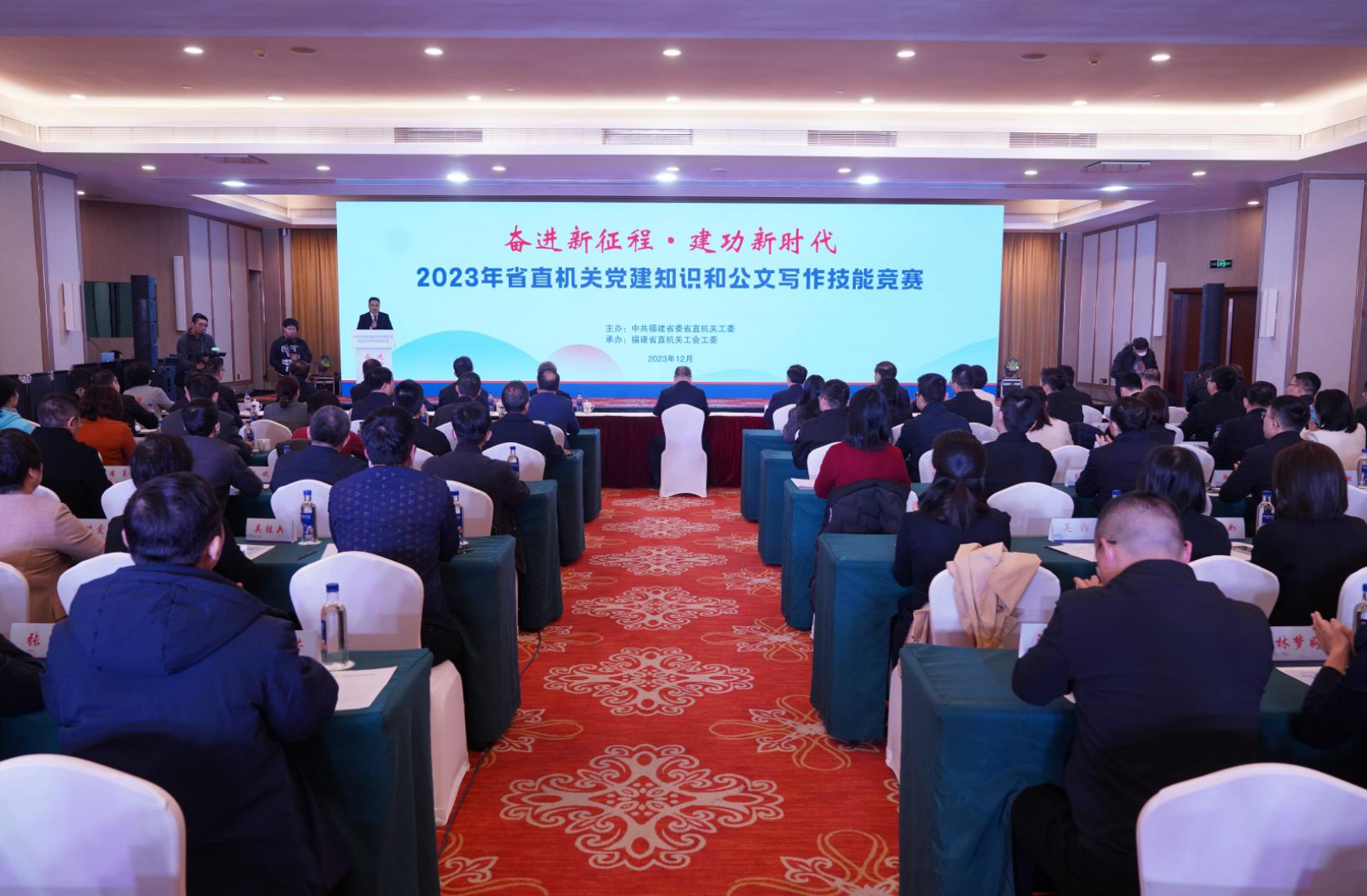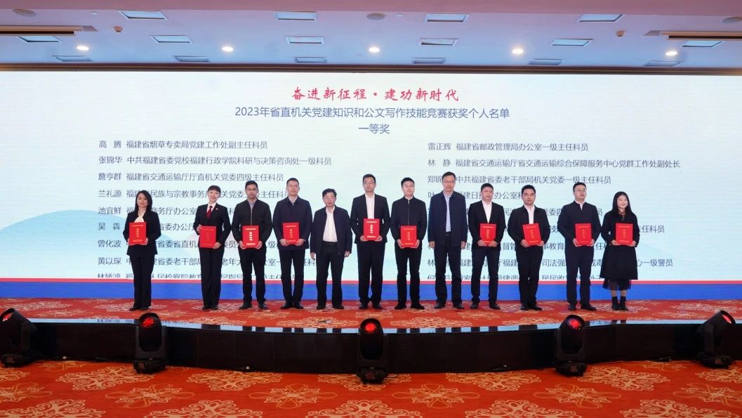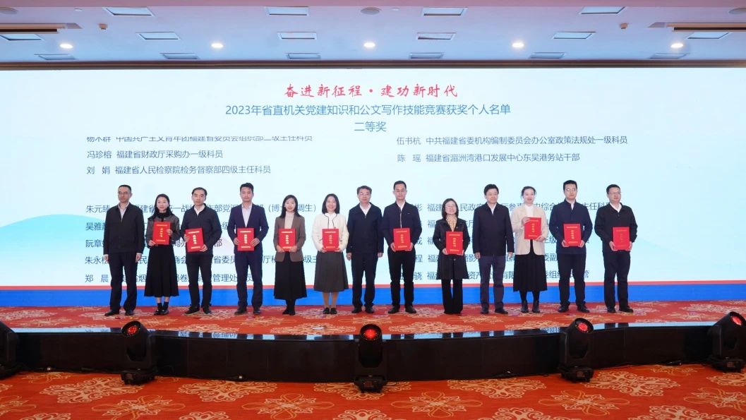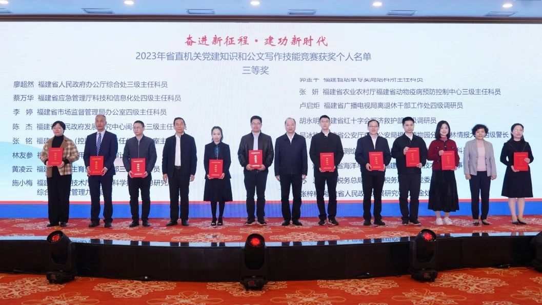 奋进新征程建功新时代——2023年省直机关党建知识和公文写作技能竞赛经过个人和团体赛后,于12月7日上午举行最后阶段的点评、颁奖和培训。省委省直机关工委分管日常工作的副书记张源生、副书记沈燕雄,工委委员、省直工会工委主席陈雁,省总工会党组成员、经审委主任卢明琪,以及团体赛参赛单位的领导出席颁奖活动。
