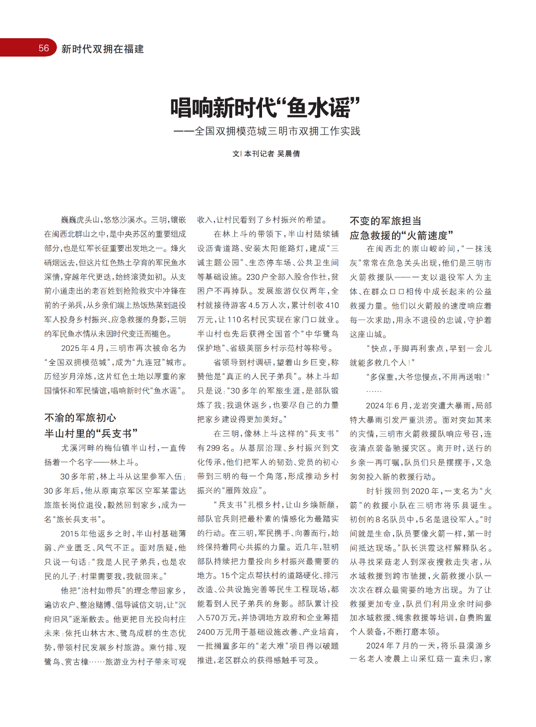 巍巍虎头山,悠悠沙溪水。三明,镶嵌在闽西北群山之中,是中央苏区的重要组成部分,也是红军长征重要出发地之一。烽火硝烟远去,但这片红色热土孕育的军民鱼水深情,穿越年代更迭,始终滚烫如初。从支前小道走出的老百姓到抢险救灾中冲锋在前的子弟兵,从乡亲们端上热饭热菜到退役军人投身乡村振兴、应急救援的身影,三明的军民鱼水情从未因时代变迁而褪色。