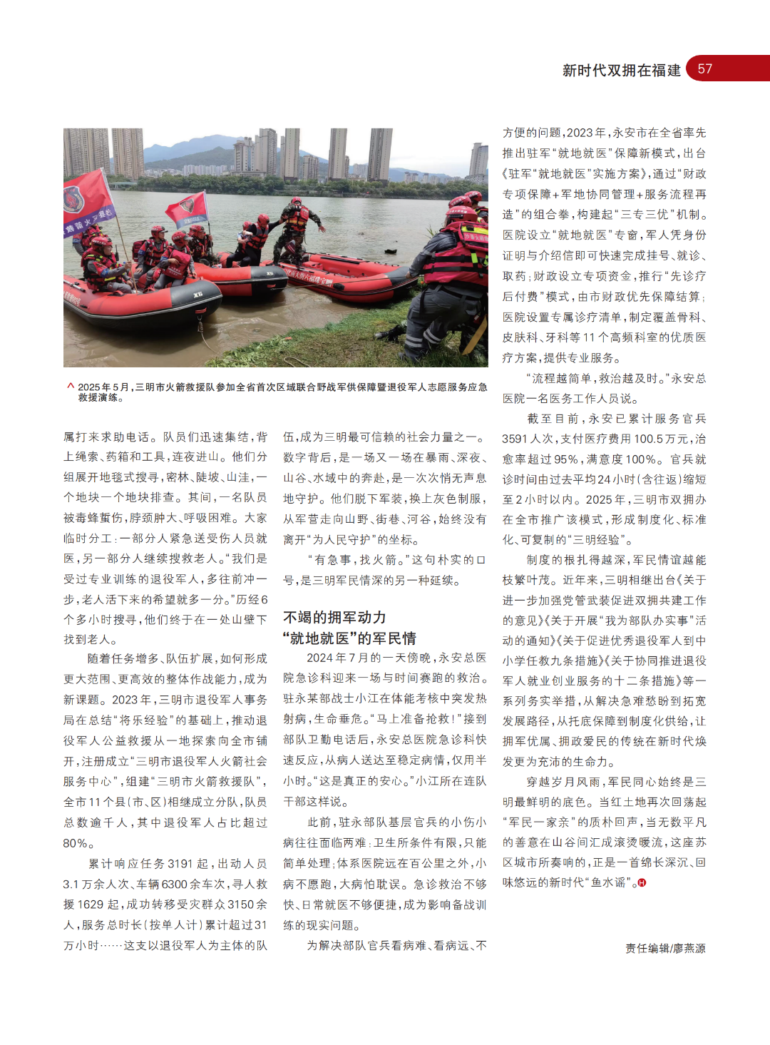 累计响应任务3191起,出动人员3.1万余人次、车辆6300余车次,寻人救援1629起,成功转移受灾群众3150余人,服务总时长(按单人计)累计超过31万小时……这支以退役军人为主体的队伍,成为三明最可信赖的社会力量之一。数字背后,是一场又一场在暴雨、深夜、山谷、水域中的奔赴,是一次次悄无声息地守护。他们脱下军装,换上灰色制服,从军营走向山野、街巷、河谷,始终没有离开“为人民守护”的坐标。