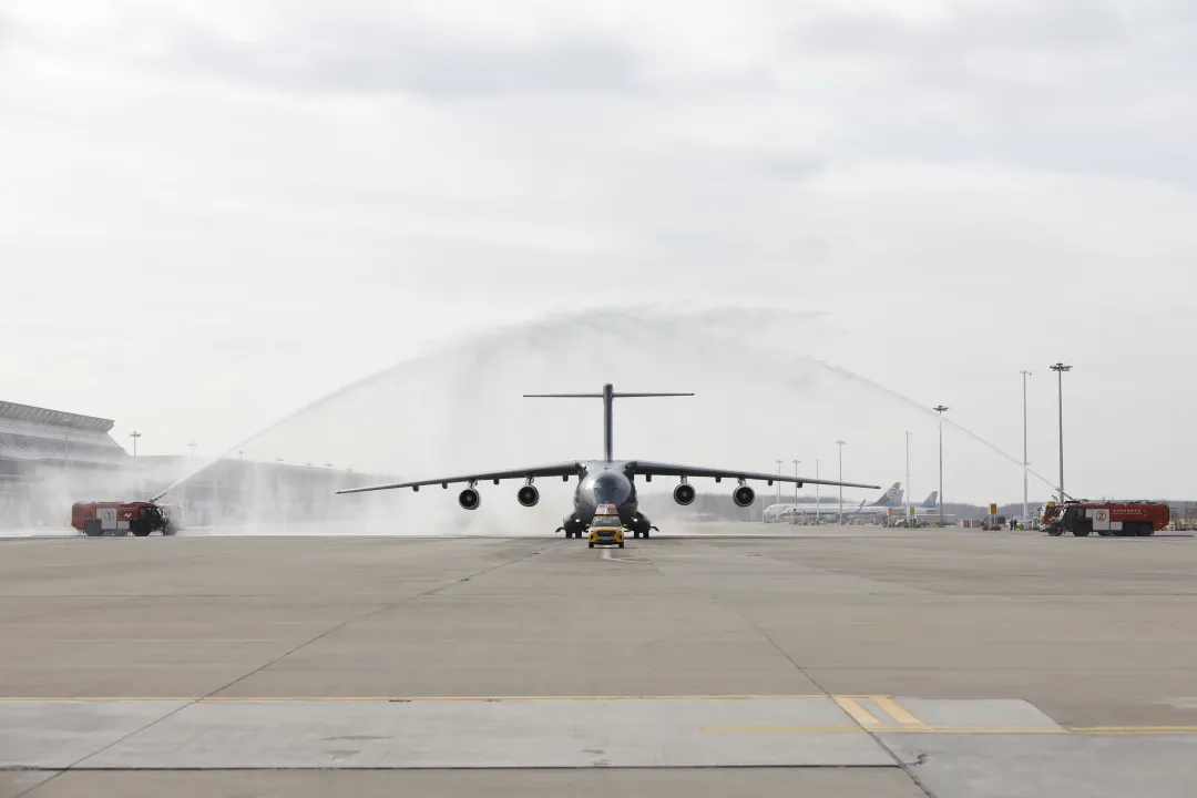 11月28日上午,空军专机运-20降落在辽宁沈阳桃仙国际机场。沈阳桃仙机场以“过水门”航空最高礼仪迎接志愿军烈士遗骸回家。陈建辰 摄