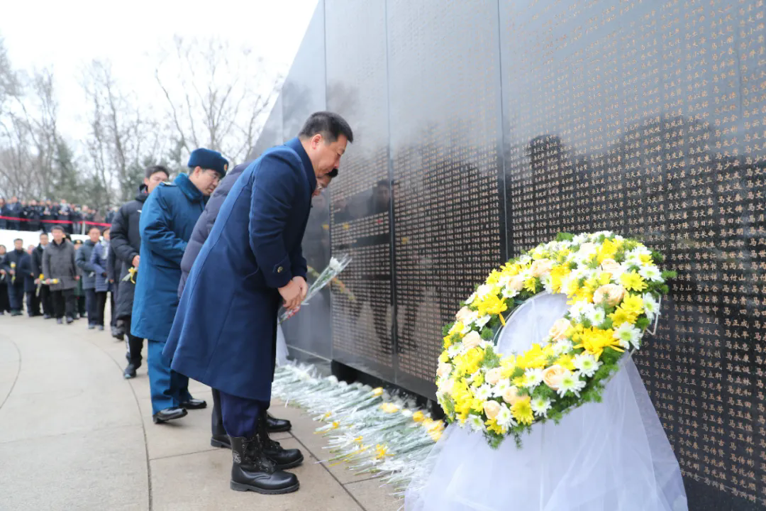 图为参加安葬仪式的社会各界代表向烈士献花致敬,并瞻仰烈士英名墙。曹舒昊 摄