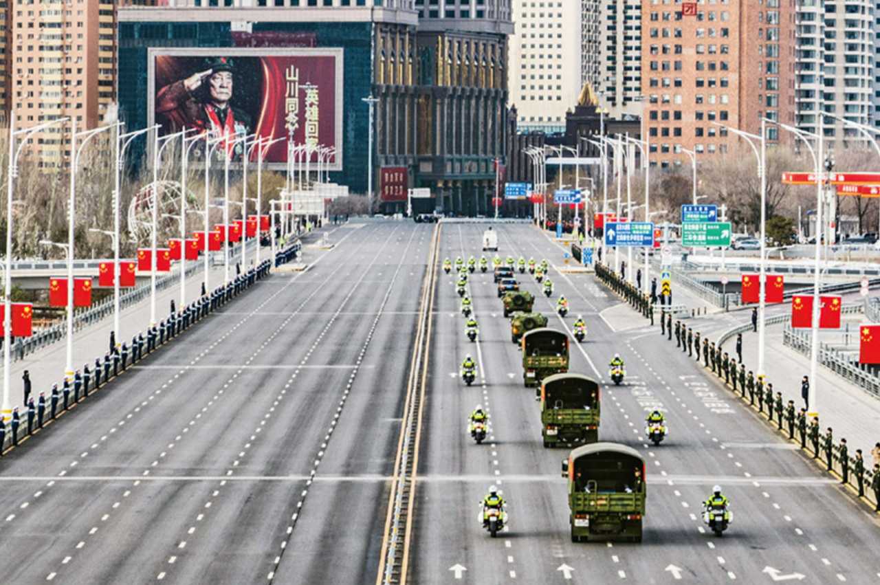 2024年11月28日,第十一批在韩中国人民志愿军烈士遗骸回国。自2014年起,我国连续11年共迎回了981位在韩中国人民志愿军烈士的遗骸,让长眠异国他乡的英雄回到阔别多年的祖国。图为当日运送志愿军烈士遗骸的车队经过沈阳青年大街(无人机照片)。新华社发 许志康/摄