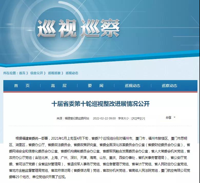 根据福建省委统一部署,2021年1月上旬至4月下旬,省委7个巡视组分别对福州市、厦门市,福州市鼓楼区、厦门市思明区、湖里区,省委办公厅、省委政法委员会、省委政策研究室、省委全面深化改革委员会办公室(省委财经委员会办公室)、省委网络安全和信息化委员会办公室、省委机构编制委员会办公室、省委军民融合发展委员会办公室,省人大常委会机关党组,省政府办公厅党组(含驻北京、上海、广州、深圳、天津、海南、山东、重庆、西安办事处,省机关事务管理局)、省公安厅党委、省司法厅党委(含省监狱管理局)、省退役军人事务厅党组、省应急管理厅党组、省审计厅党组、省人民防空办公室党组、省地方金融监督管理局党组、省政府信访局(省委信访局)党组,省政协机关党组,省高级人民法院党组,厦门航空有限公司党委等25个地方、单位党组织开展了巡视。