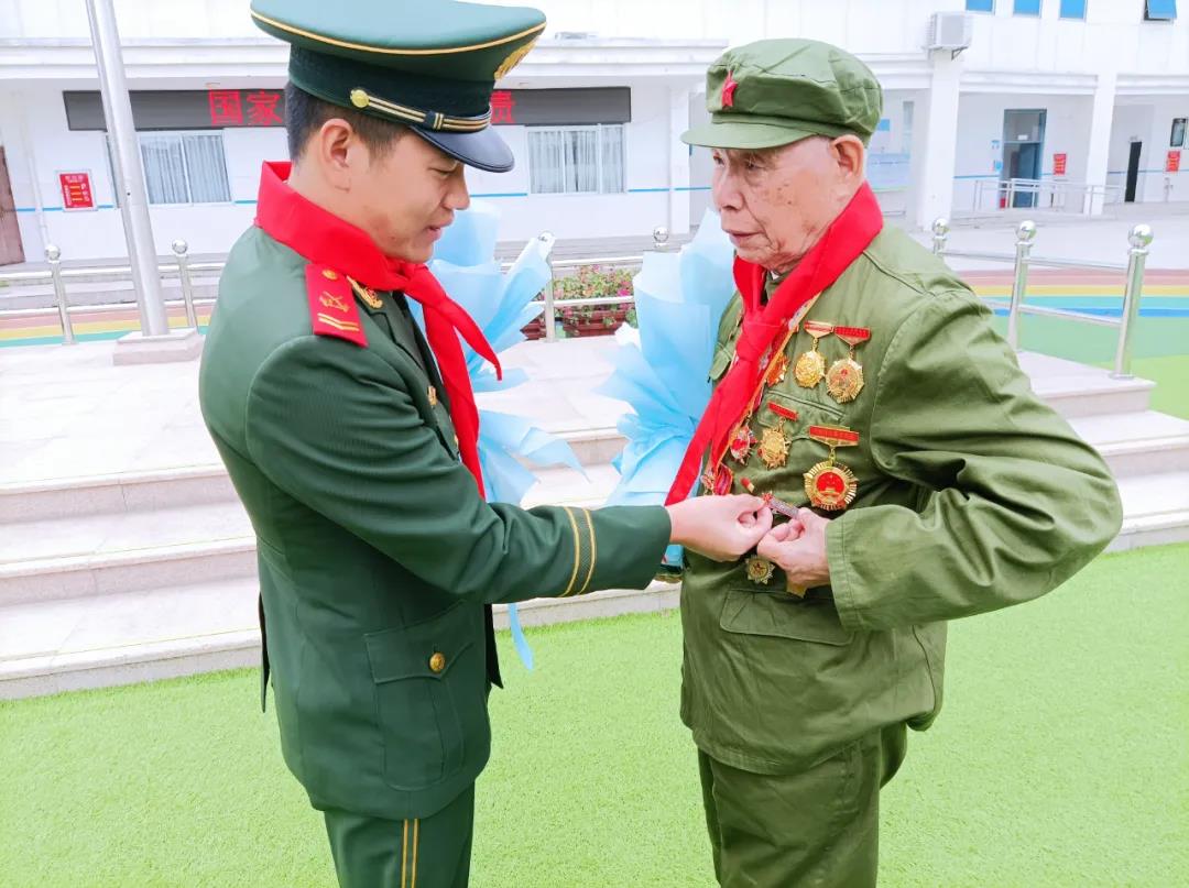 在庄严的国歌声中,新老功臣同师生们一起参加升旗仪式,行少先队礼、佩戴红领巾、敬献鲜花,在现场,师生第一次为见到佩戴军功章的爷爷、叔叔,再次响起热烈的掌声。“崇尚英雄是我们这个时代必不可少的精气神,没有他们为祖国为人民出生入死,就没有今天幸福的生活,也没有学生们安详的学习环境。”主持人的介绍引来师生们不断的点头赞美。