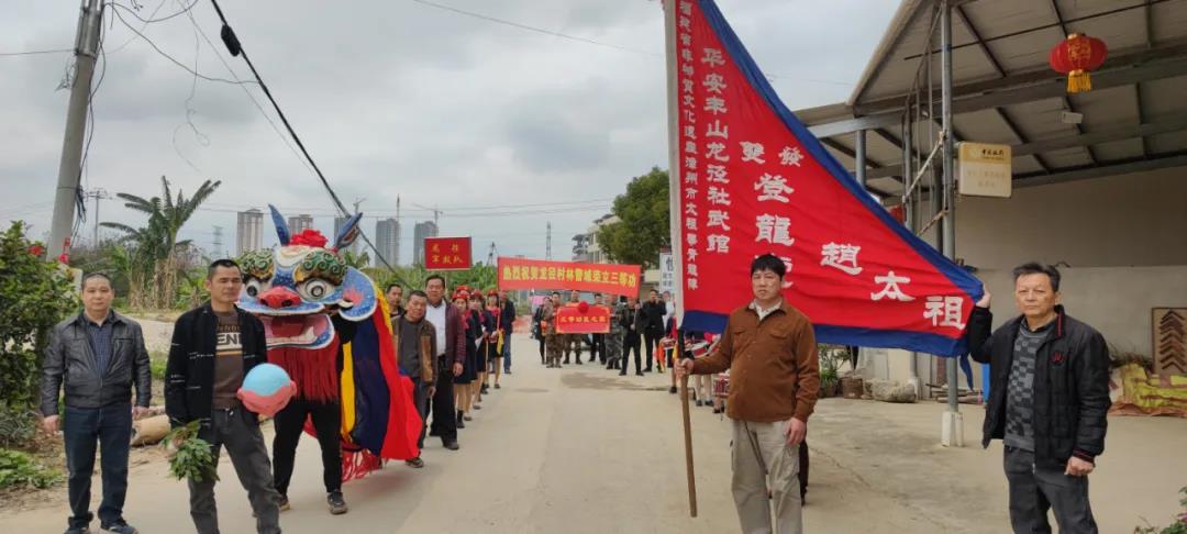 2月17日,华安县丰山镇龙径村,大旗开道,舞狮和龙径军鼓队敲锣打鼓,鞭炮齐鸣,好热闹的场面。“三等功臣之家”横幅、牌匾,军地领导一起欢天喜地把三等功、“四有”优秀士兵两份喜报送到林警城家门口。