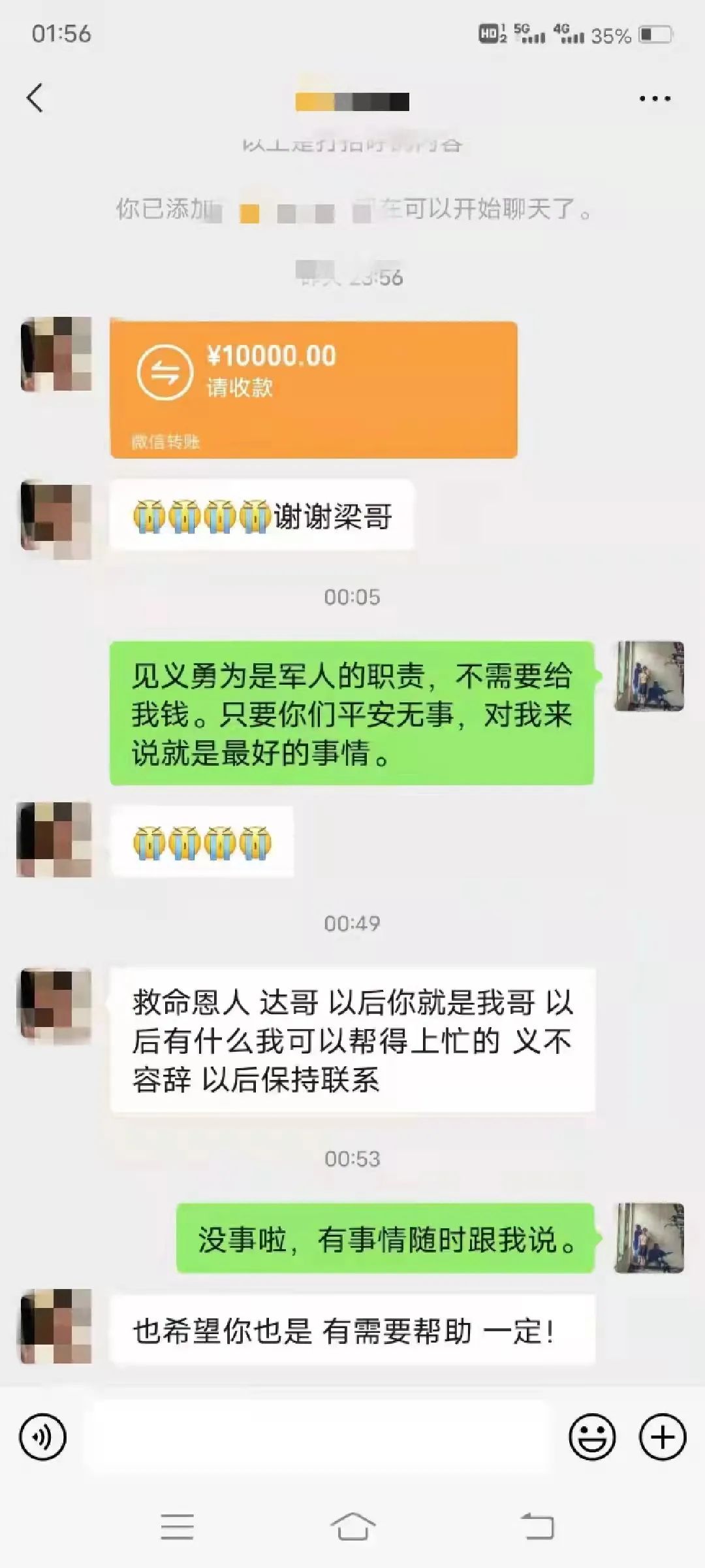 “后来,对方用微信转了一万元给我表达谢意,被我谢绝了!我也同我妻子明确表示,不能收他们的钱,保护人民群众生命安全是军人的职责,这是我应该做的。”谈起救人经历,梁长达显得十分高兴。