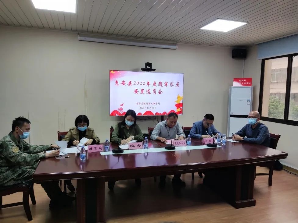 11月23日,泉州市惠安县召开2022年度随军家属公开选岗会。县委编办,县人武部、教育局、人社局、退役军人局和派驻纪检组,驻惠部队现役军人随军家属等参加会议。