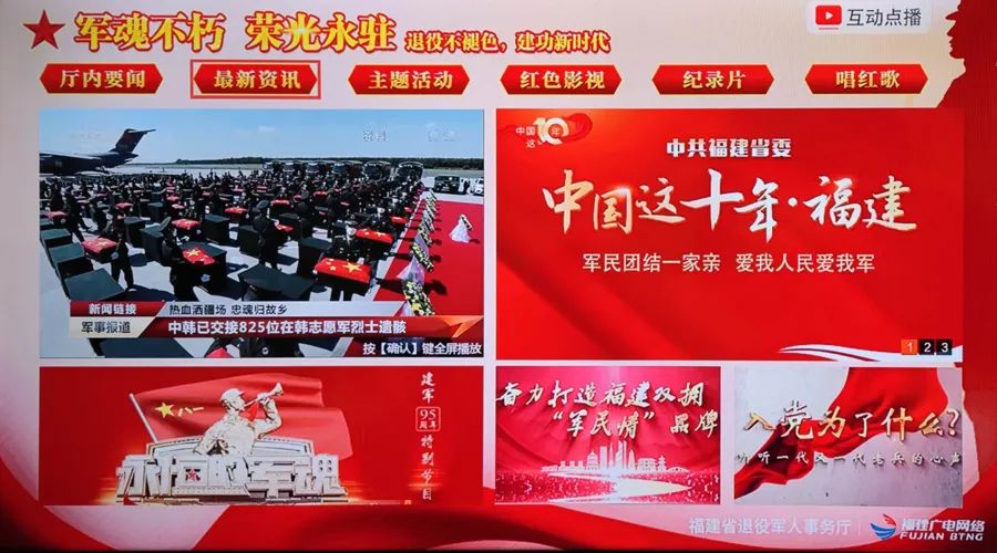 为打造福建“军民情”双拥品牌,福建省退役军人事务厅与福建广电网络集团深化合作,共同为退役军人群体定制开发了全国首个省级退役军人电视专区——“军魂不朽荣光永驻”。专区开发了专版功能,授权电视用户机顶盒启动可直接进入专区首页,收看专属视听节目,方便全省退役军人军属及时了解退役军人事务相关资讯。在建军95周年之际,2022年8月5日我们与省退役军人事务厅举行共建合作签约仪式,以“八个行动”为核心,开启拥军优抚新征程。