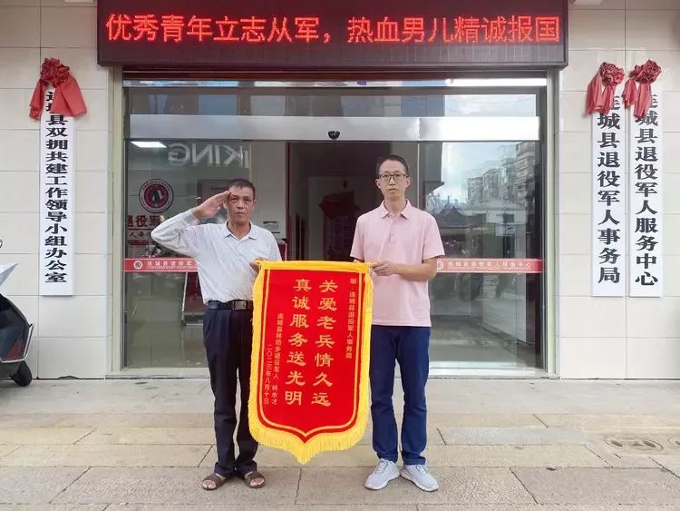 日前,65岁的老兵老林亲手将三面锦旗分别送到龙岩市退役军人事务局、连城县退役军人事务局和龙岩爱尔眼科医院,并激动地向负责人和医护人员敬礼致谢。