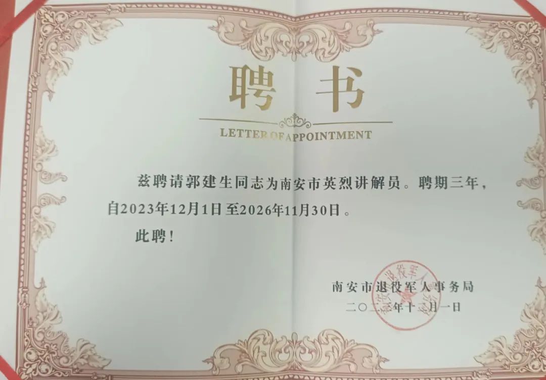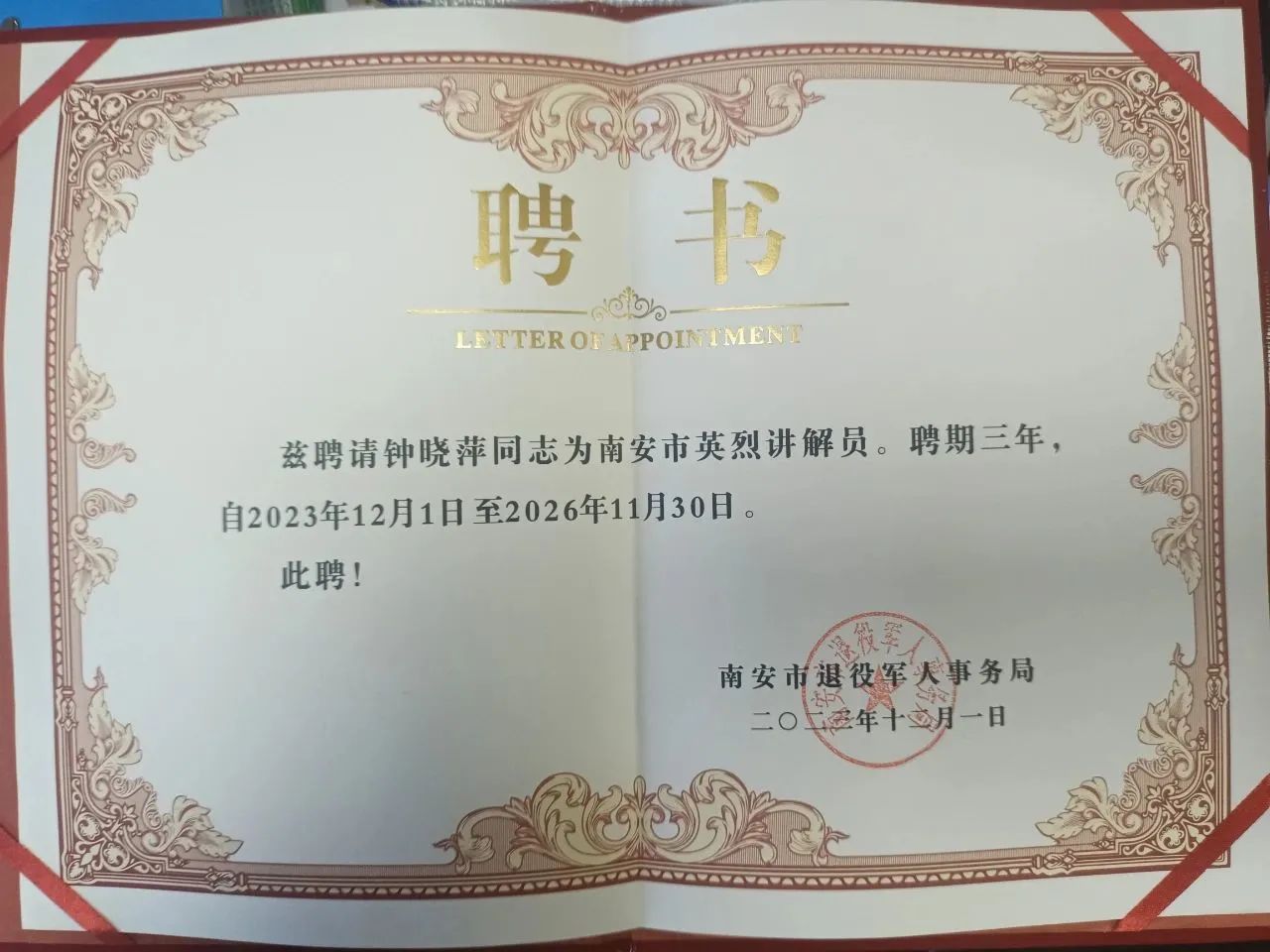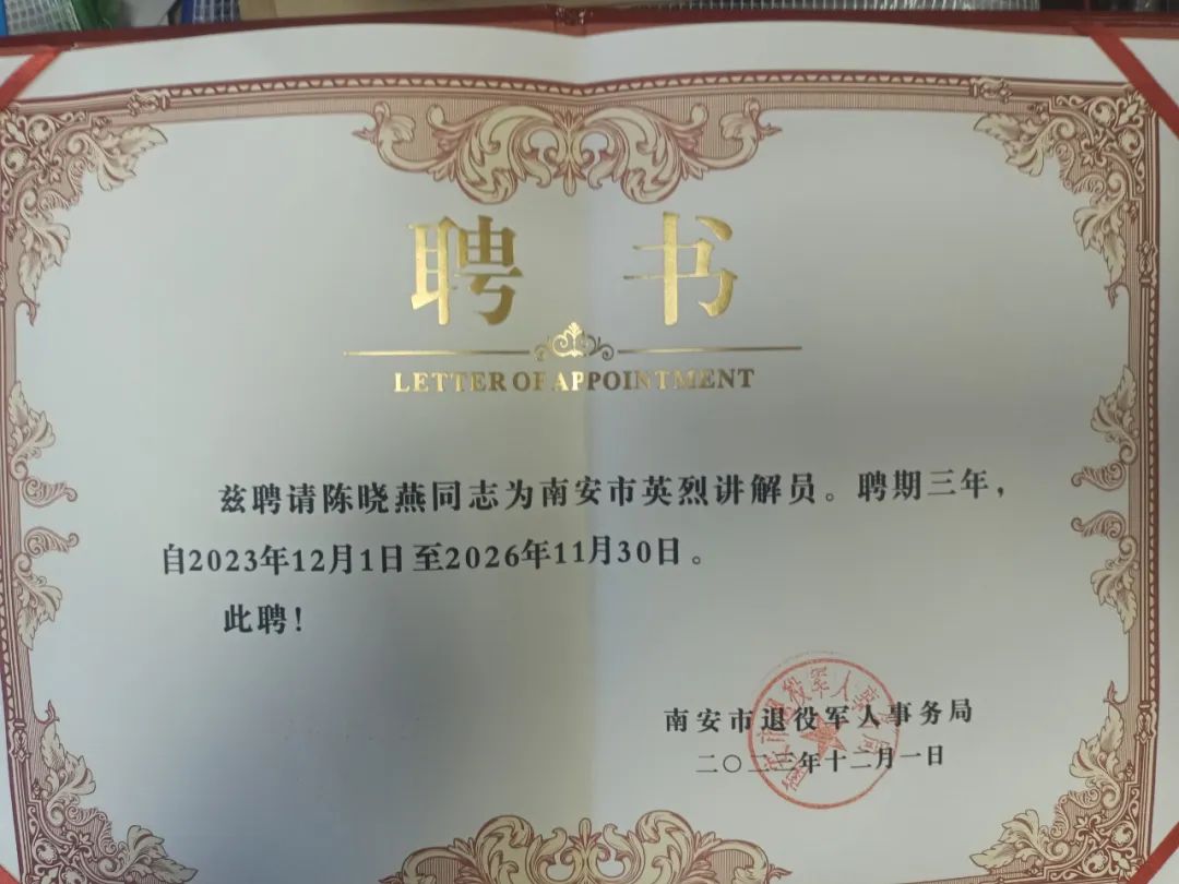 此次聘请的5位英烈讲解员来自不同的岗位,有刚刚荣获福建省“国防人物”称号、南安市官桥中心小学教师钟晓萍;有曾荣获泉州市八闽英烈讲解员大赛专业组第一名、福建省八闽英烈讲解员大赛专业组第二名的泉州华侨革命历史博物馆讲解员刘丽红;有年逾古稀、坚持38年义务担任红色故事讲解员的蓬华镇参战老兵郭建生;有身处叶飞将军的故乡、被群众尊称为“英烈故事大王”的“兵支书”叶奕坚;有后起之秀、南安市翔云镇退役军人服务站退役军人事务员陈晓燕。他们都在各自的岗位上数年如一日坚持讲好英烈故事,弘扬英烈精神,在英烈故事宣传讲解方面达到较高的水准。