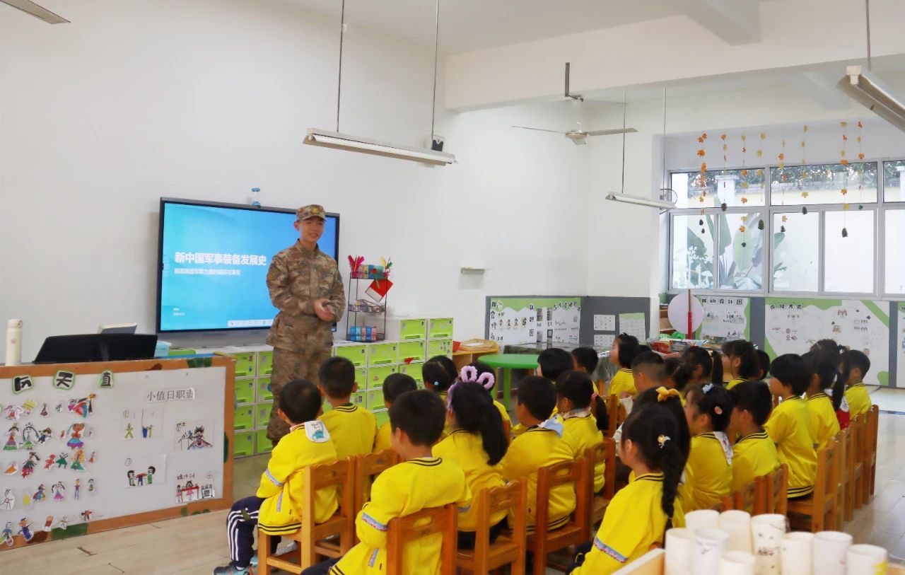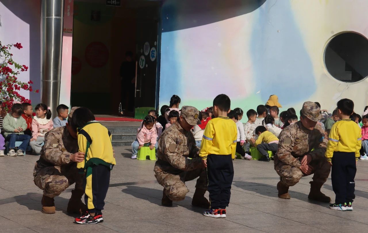 在实验幼儿园的操场上,官兵们为同学们演示战术动作,精湛的技能和过硬的本领赢得了大家热烈的掌声。为了满足同学们跃跃欲试的“当兵瘾”,官兵们对同学们开展了队列训练。“立正、稍息、向右转……”同学们在官兵们的指挥下进行着各项队列基本动作,一举一动,有板有眼。