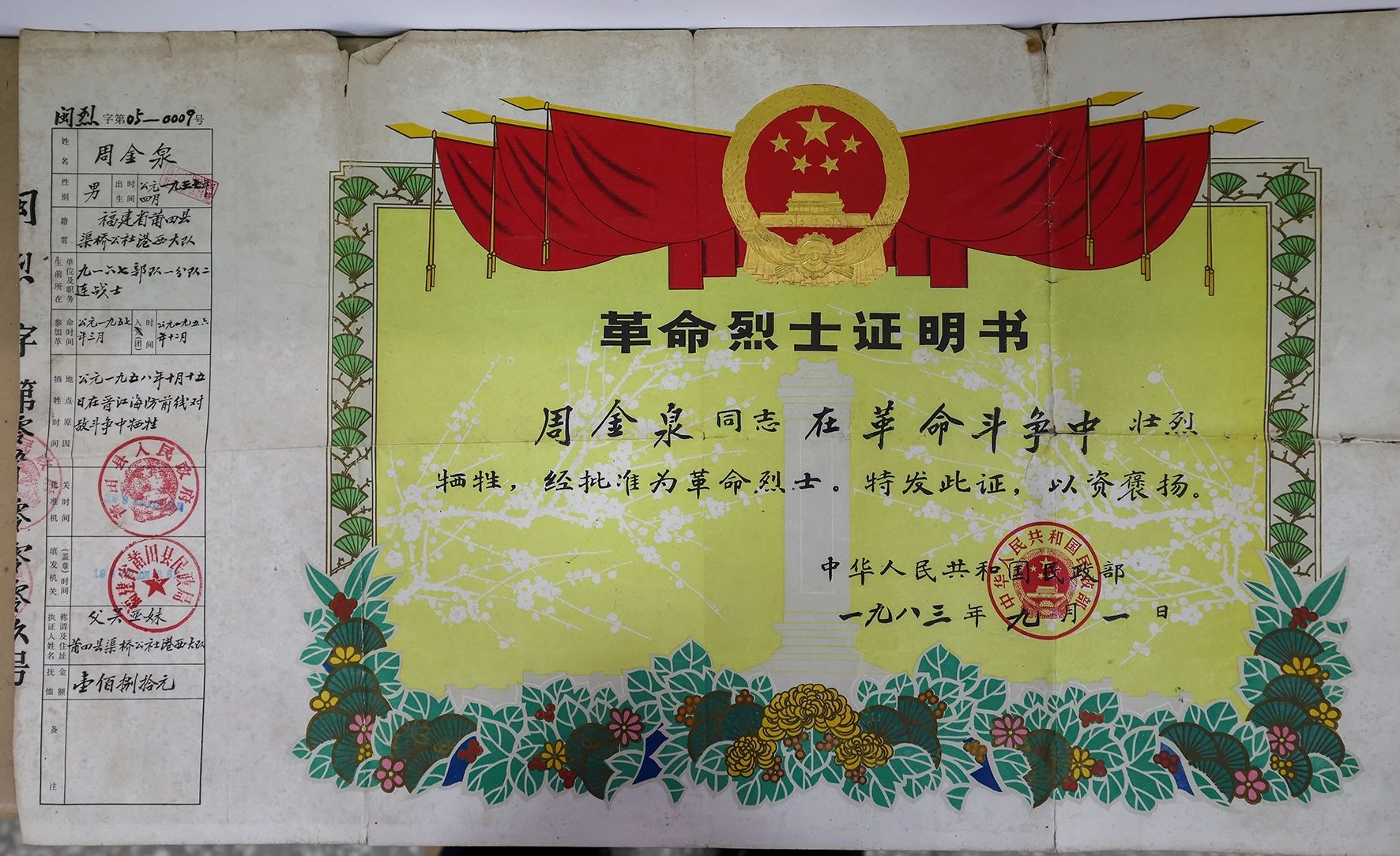 根据中华英烈网记载及石狮、荔城两地退役军人事务局核实,周金泉同志1937年4月出生于莆田县渠桥公社港西大队(现莆田市荔城区新度镇港西村),1956年12月加入中国共青团,1957年3月参军,在九一六七部队一分队二连任战士。1958年10月15日在晋江海防前线对敌斗争中壮烈牺牲。昨日,在祥农村委会举行的周金泉烈士遗骸交接仪式上,烈士亲属还带来了周金泉的《革命烈士证明书》。