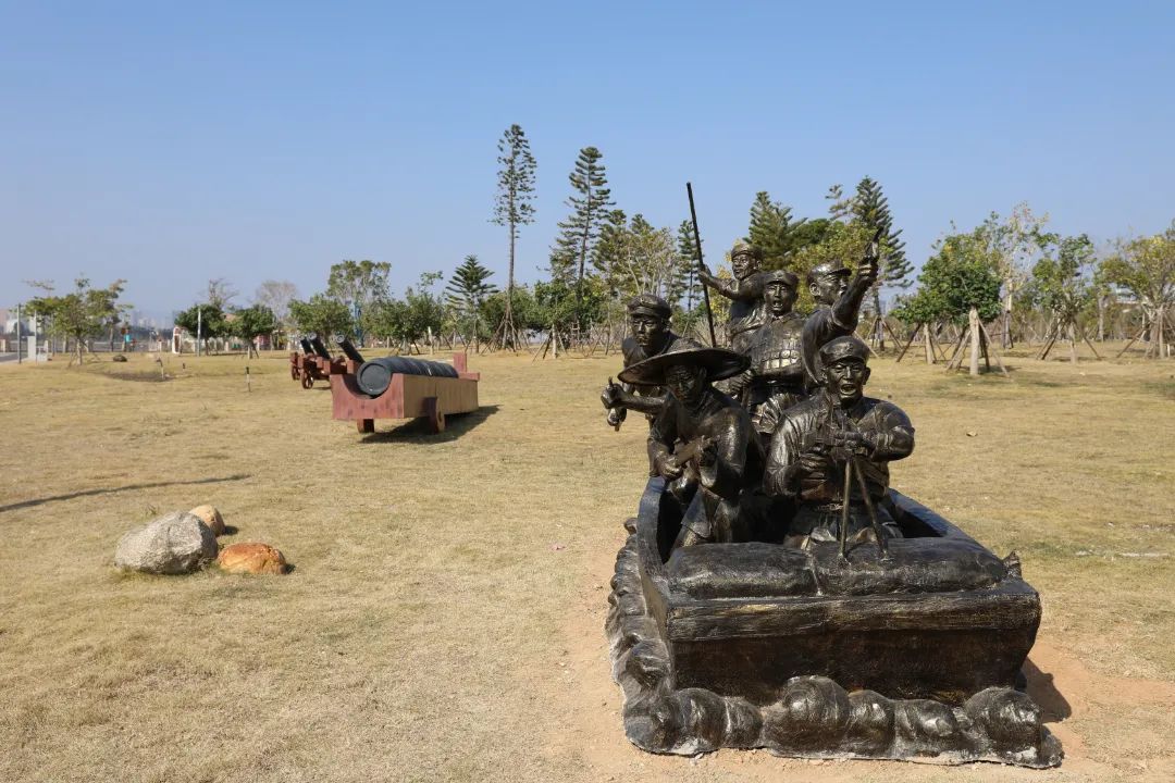 据了解,枪城双拥公园的“枪城”前身是原泉州鹧鸪口铳台、鹧鸪巡检司的遗址,距今近400年历史,曾是泉州古代抗倭的前哨站,是护卫晋江入海口的重要依托。枪城双拥公园吸收原有遗址所具有的元素,融入新时代双拥元素,打造了一个集双拥共建、群众文化、休闲娱乐于一体的双拥主题公园,公园占地面积42.75亩,以“拥军优属、拥政爱民”为主题,融合蟳埔蚵壳厝的建筑元素,以承载蟳埔枪城红色文化为特色,建设有船舵导视牌、双拥主题宣传栏、双拥主题雕塑、刺桐英雄长廊、蟳埔枪城小岛——双拥宣传展厅、国防教育展厅等区域,将双拥元素与自然景观以及海丝民俗文化特色和谐融为一体。通过展示双拥文化及“军”的特色,深刻反映了军民鱼水情深,大力宣扬革命先辈不怕艰难困苦、勇于斗争的革命英雄主义精神,极大地激发广大市民爱国拥军的热情。