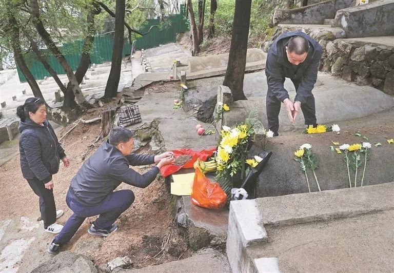 徐长明说,他们将老家江尧年衣冠冢前的土带来了。徐长明、江尧富将黄土轻轻地撒在烈士墓及周边。做完这些,三人理好衣着,轮流郑重地向烈士磕头行礼。