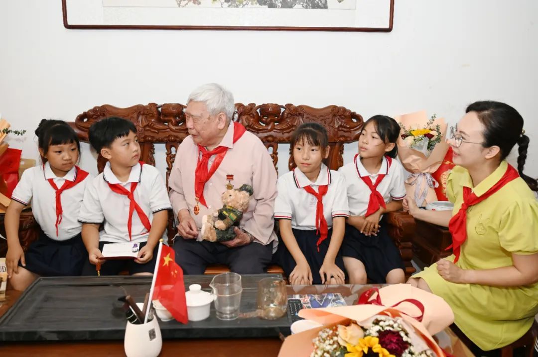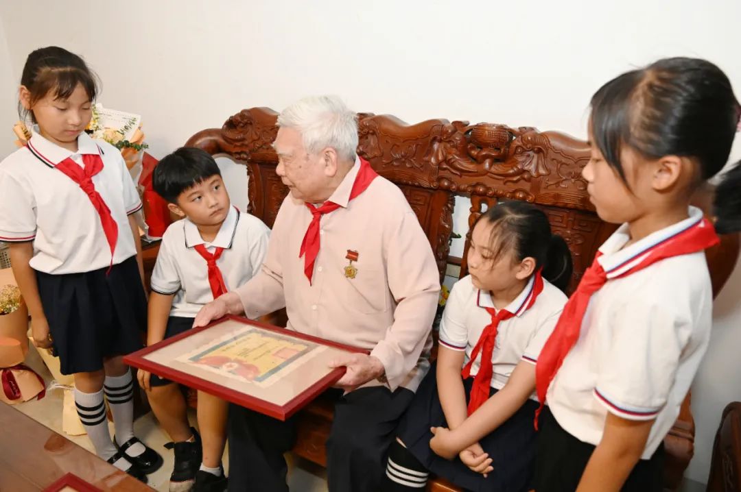 “心怀感恩,喝水不忘挖井人!”近日,漳州市巷口中心小学的8名少先队员怀着崇敬之心,踏进了92岁抗美援朝老兵陈吉福的家中。在温馨的客厅里,二4中队杨向上同学将精心准备的礼物——一封字迹工整的慰问信和身着迷彩军装的布偶,郑重交到老英雄手中。陈老颤抖的双手轻轻摩挲着军装布偶,激动地说:“你们是祖国的未来和希望,让祖国变得更强大要靠你们了……”