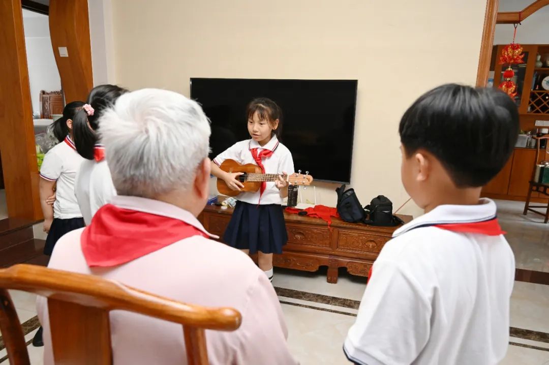 “长亭外,古道边……”暮色漫过窗棂时,队员黄亦依怀中的尤克里里淌出《送别》的旋律。“谢谢陈爷爷!”带队的大队辅导员陆艳莉老师望着老人与孩子们紧握的双手,轻声感慨:“这不是一次普通的课外活动,而是红色基因在嫁接年轮。”陆老师介绍,学校后续还将开展红色家书共读、老兵进校园等活动,让英雄精神化作润泽幼苗的春雨,滋养新一代的成长。