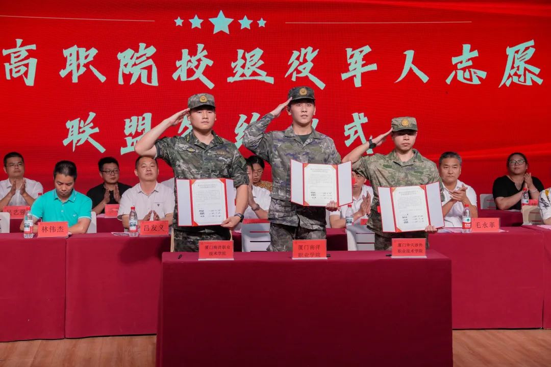 随后,举行翔安区高职院校退役军人志愿者联盟签约仪式,三家院校代表共同签署合作协议。该联盟的成立,将有效整合区域退役军人志愿服务资源,构建“优势互补、资源共享、协同发展”的工作新格局,为提升翔安区退役军人志愿服务整体水平注入新动力。活动现场,还对厦门南洋职业学院退役军人先锋队的23名优秀退役大学生士兵进行了表彰。