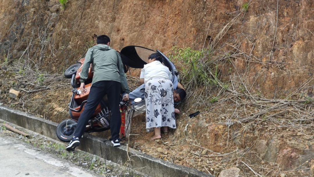 当天11时许,张琪驾车下乡途中突闻前方传来剧烈撞击声。他迅速停车查看,只见一辆蓝色三轮车侧翻在路旁,车身严重变形,驾驶员左手被卡在驾驶室与地面之间,身体无法起身,脸色苍白,痛苦呻吟。正值正午时分,乡道上车流不断,伤者若不能及时脱困,随时可能遭遇二次伤害。