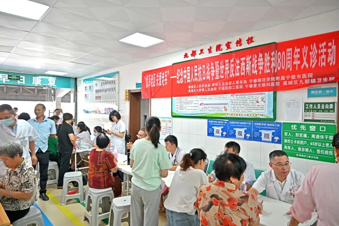 在中国共产党成立104周年、纪念中国人民抗日战争暨世界反法西斯战争胜利80周年来临之际,6月27日,由宁德市蕉城区退役军人事务局联合蕉城区人民武装部、宁德师范学院附属市医院、九都镇人民政府、宁德四四二医院、宁德爱尔眼科医院、九都镇卫生院举办的“情系老区关爱老兵”—纪念中国人民抗日战争暨世界反法西斯战争胜利80周年义诊活动在九都镇卫生院举行。