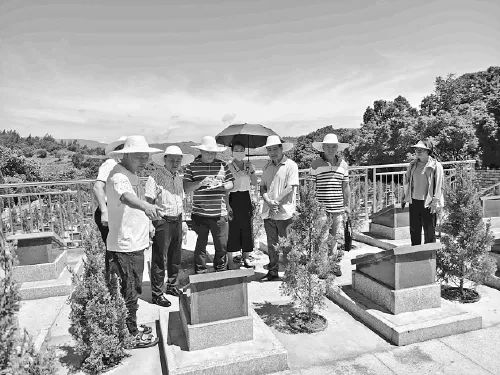工作人员在连江官坂烈士陵园进行边界勘察并核对烈士碑文。